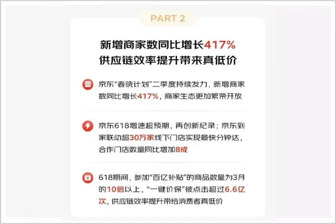 刘强东确立的战略,组织架构调整,第三方商家招募,这一系列的动作最终落实到商品和运营上。商品流量分发上,京东以单品到手价最低为基础,利润不那么高、价格更低的商品将获得更多流量;据悉,今年618期间,京东内部要求,价格在流量搜索分发上所占的权重不得低于50%。