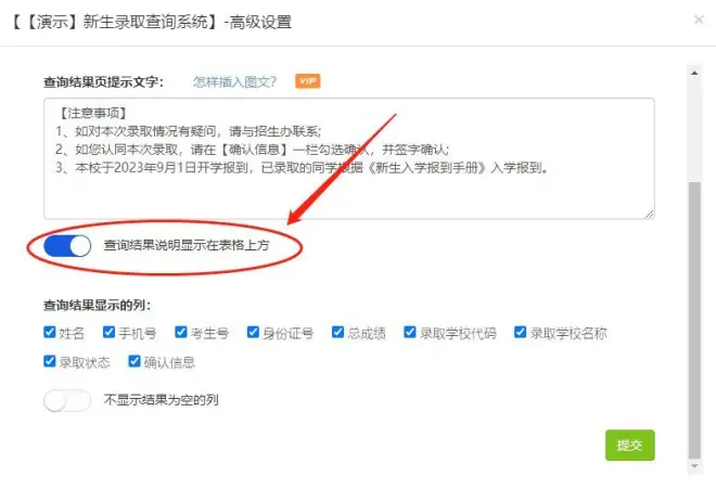 3、查询结果页提示文字:这里的内容就是新建查询时的查询结果页提示文字,这里可以对录取结果注意事项内容进行修改、编辑;