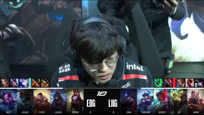 第一局比赛,EDG蓝色方,禁用德莱文、维鲁斯、寒冰、泰坦、鳄鱼,选用凯南、茂凯、杰斯、厄斐琉斯、璐璐;LNG红色方,禁用女警、盲僧、卢锡安、塞恩、锤石,选用贾克斯、瑟庄妮、永恩、泽丽、洛。