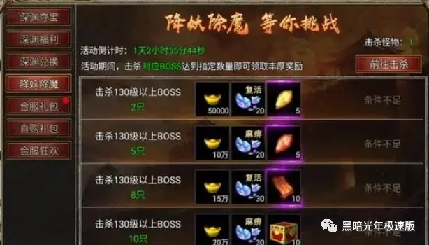 在活动期间,击杀对应的boss,达到指定数量即可领取丰厚奖励。这是一个刺激有趣的战斗之旅,用你的实力去证明自己吧!