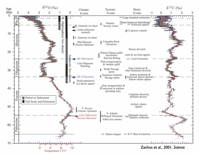 整个环流在1600年左右即可完成一次,而海洋生物,如底栖有孔虫类benthic foraminiferas会记录下这个过程中的碳氧同位素变化,最终便形成了下图中全球65Ma年以来的碳氧同位素记录;