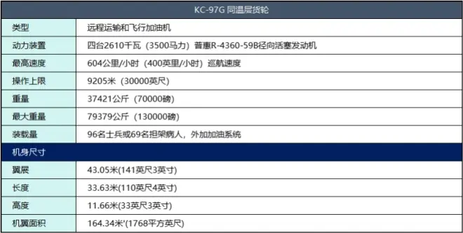 多功能性的KC-97G使该飞机能够在不拆除加油系统的情况下运送货物或乘客,这是最常见的一种使用模式。