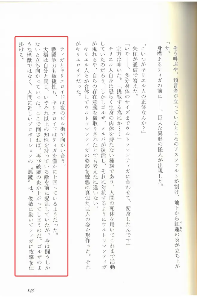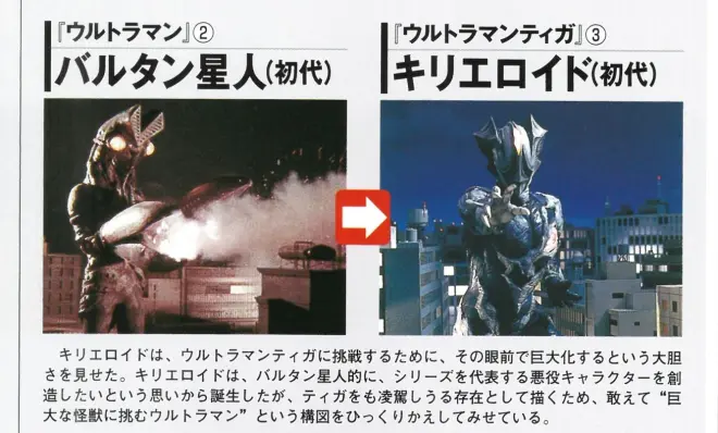 基里艾洛德、展现出了为了挑战迪迦奥特曼、在其面前巨大化的大胆性。基里艾洛德、是从想要创造出巴尔坦星人般的、代表系列的反派角色这种想法中诞生的、因为是为了描绘身为凌驾于迪迦之上的存在、所以刻意去颠覆了“挑战巨大怪兽的奥特曼”的构图。