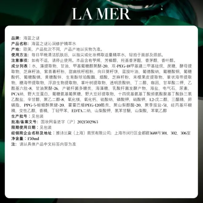 3.4 安全可靠:海蓝之谜(LA MER)修护精萃水经过多重质量检测认证,不含任何有害成分,可以放心使用。
