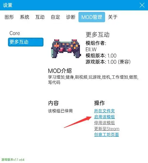 5、找到需要启动的MOD,选择启用该模组,再次退出重启软件方可应用该模组。