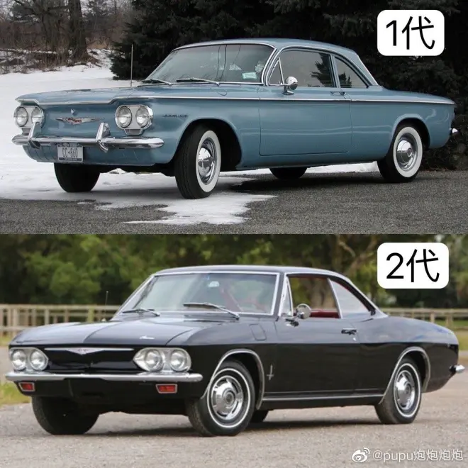 大体上Corvair可以分成两代,1960年推出的一代更方正些,1965年推出的二代更帅气些。
