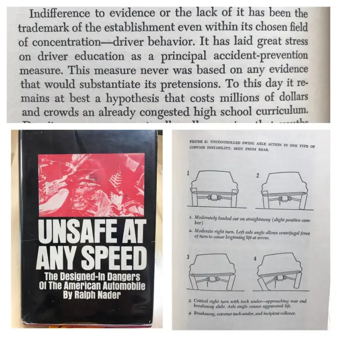 Ralph在书中称由于第一代Corvair的大部分重量在车尾,而它用的是独立悬挂,还没有防倾杆,所以车在急弯状态下容易侧翻。他还怕人们看不见,所以把这些内容特意放在了第一章!