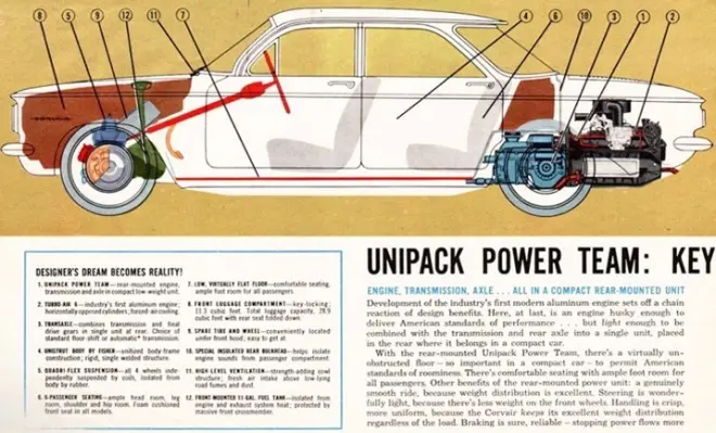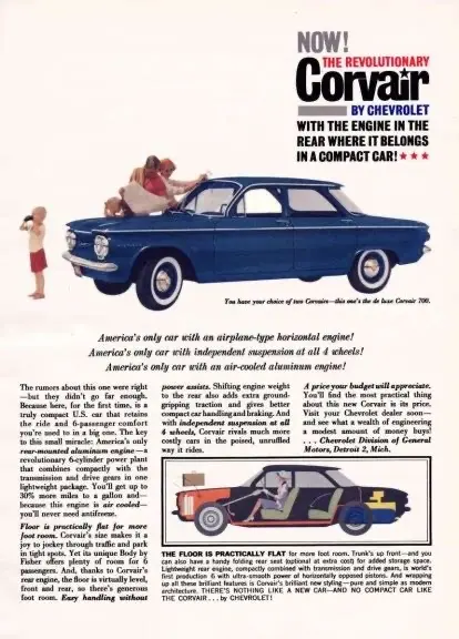 通用汽车打算设计一款全新的美式小型车。他们借鉴了甲壳虫的设计理念,在1960年发布了一款后置后驱、搭载2.3升风冷水平对置6缸发动机的车型。