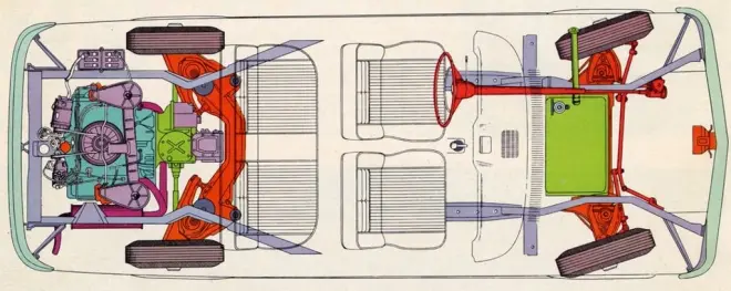 雪弗兰当时的总经理Ed Cole之所以选择给Corvair一个后置后驱布局就是为了把引擎和变速箱放一起,这样尽可能减少动力系统占用的空间,从而增大乘客和行李的空间。