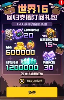 立即获得 : 金币*1,200,000+经验值*2,400,000+体力*500+强化锤(25级)*20,强化锤(50级)*5+传说中的觉醒石*10+守护者积分兑换券(24小时)*5