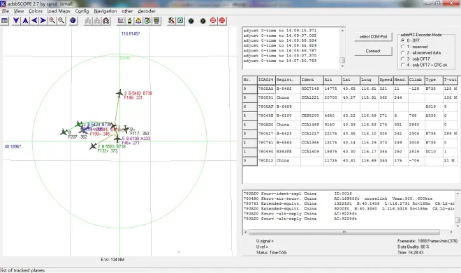 Ø 显示方式:飞机列表,内置地图 和第三方的显示软件adsbScope(免费)和planeplotter(额外收费)。