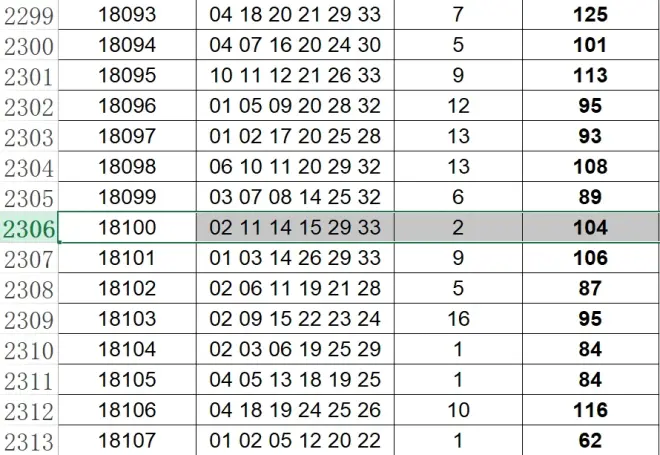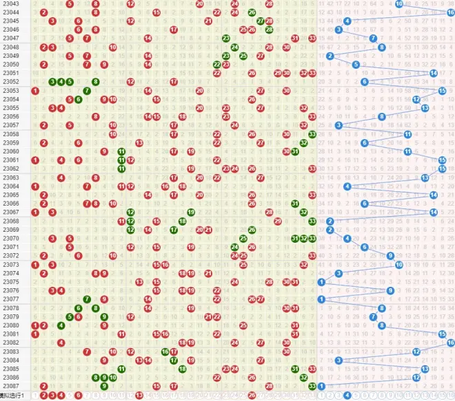 上期走势,红球奇偶比4:2,分区比2:2:2,和值104,其中两组斜连09 33,09重号,09 33 17 02分别近100期第21、22、23、24次开出,15为第14次开出,28遗漏11期开出。蓝球开奇数01,遗漏9期开出。