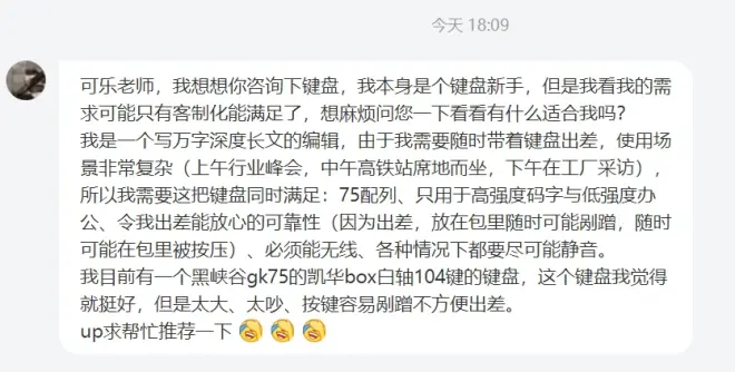 这个需求说简单也简单,因为新手小白没有用过好的键盘,只要比黑峡谷好,就行了。但是说难也难,因为他的需求其实非常细致。我又不太确定他的动手能力如何,对于手感和静音的倾向性到底在哪个点上。所以就直白一些,给一个简单的和一个复杂的解决方案。