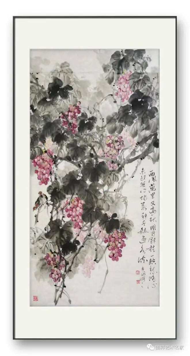 韩光明先生用笔沉酣,墨色交融,庄重高雅,珠粒饱满,立体晶莹,明暗虚实,将葡萄的秉性与韵味一笔呵成,给人以视觉和心灵的冲击。