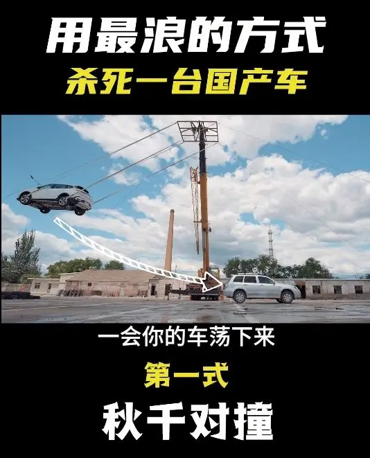 浪荡四式第一式,“秋千对撞”。将奔腾T90悬吊在高空,然后高速荡下来,以尾部撞击另一台车辆尾部,来模拟奔腾T90被追尾的情况。撞击结果是,另一台SUV的尾部几乎全部凹陷,而奔腾T90只有后防撞梁略有变形,吸能盒几乎保持原样,正常启动行驶没问题,甚至电动尾门还能正常使用。