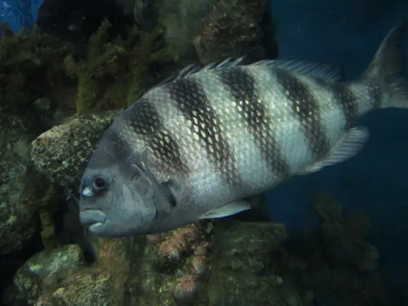接下来进入全馆的最引以为傲的全长155米的水底隧道区,展示了5种截然不同的海底环境,第一段为近岸珊瑚礁,饲养了许多珊瑚礁中大型鱼类,不乏部分顶级掠食者,其中有数量庞大的皱唇鲨,馆内人工繁殖的豹纹鲨亚成体和鲜少展示的狭纹虎鲨,以及从美国佛罗里达州引进的羊头鲷。隧道内还有一定数量的裸胸鳝。