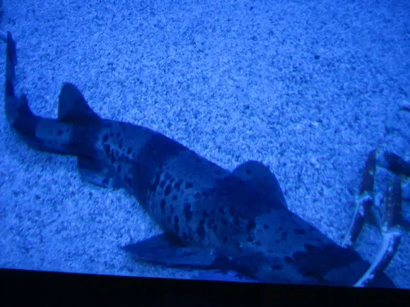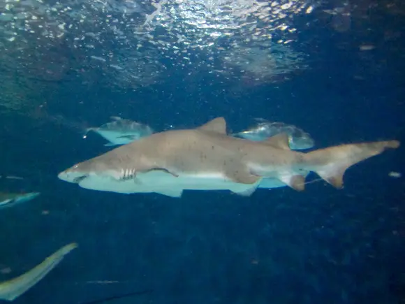 第四段隧道“鲨鱼海湾”是全馆水体量最大的区域,也是重头戏所在,饲养了10种顶级掠食性软骨鱼类,包括国内最大种群的锥齿鲨、正在繁殖的濒危物种豹纹鲨、体型巨大的圆犁头鳐、波缘窄尾魟和非常少见的糙沙粒魟,混养了一大群浪人鲹,全部为凶猛鱼类。这个区域在2010年之前还饲养有3头低鳍真鲨(公牛鲨)和数尾犁鳍柠檬鲨。