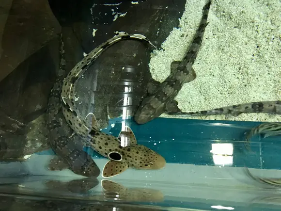 右手边是曾经常设的“SOS拯救鲨鱼展”,饲养展示数种小型鲨鱼和鲨鱼孵化过程。该展区在巅峰时期曾经展出过日本扁鲨和澳大利亚虎鲨。2019年之后这里开始关闭整改,2022年以全新的海洋教室开放,除了原来的条纹斑竹鲨和鲨鱼卵孵化过程外,还增加了白斑斑鲨、汤氏团扇鳐和一些海洋无脊椎动物等。