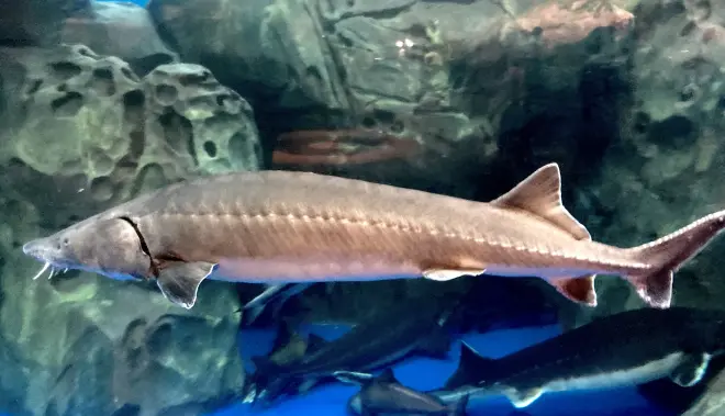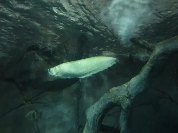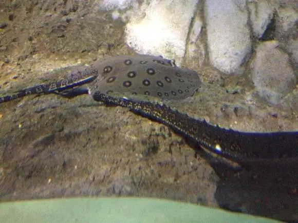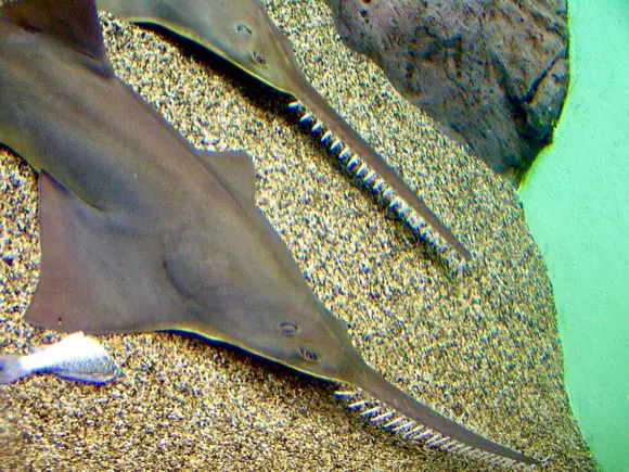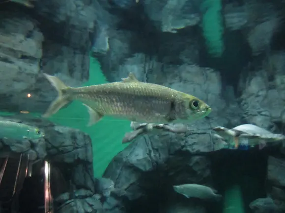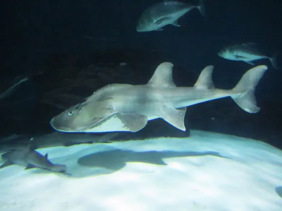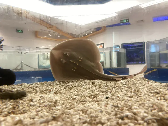 地上二层澳大利亚展区:全国唯一的淡水饲养的大齿锯鳐,濒危等级为CR极危的锯鳐,开馆引进之初算得上是能与叶海龙、翻车鲀并齐的大咖级物种,起初引进了两尾幼体(一雄一雌)目前展出一尾成年雄性。在隔壁的展缸中有大眼海鲢、墨瑞鳕和猪鼻龟,近日将大眼海鲢更换为了体型更大的泰庞海鲢。