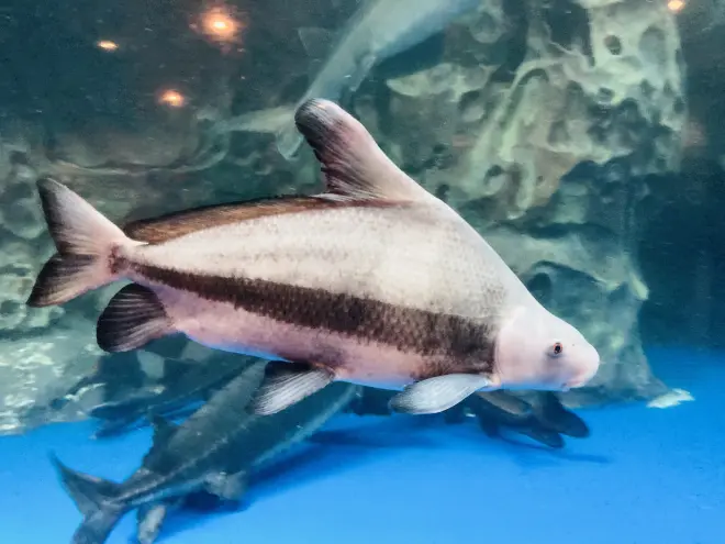 接下来是第一个主题展区——中国展区,中国区四个展池的主角分别是中华鲟、胭脂鱼、扬子鳄、大鲵、四大家鱼。这个区域的布置和物种几乎是万年不变,其中最有看点的是扬子鳄与家鸭以及倒刺鲃、团头鲂、翘嘴鲌、大口鲶的混养,中国展区的大厅中央经常会举办各种主题的特展,可以在节假日时看到。