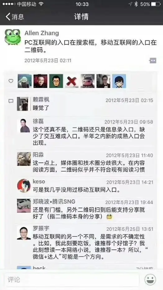 微信创始人张小龙在2012年5月发了一条朋友圈:“PC互联网的入口在搜索框,移动互联网的入口在二维码。”当时很多人并不认同这样的观点,有人直言自己从来没用过二维码,也有人认为二维码只是信息录入口。