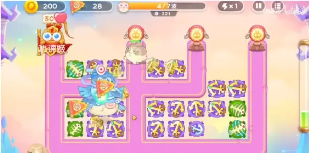 4、等第五波在起点毒针,然后有钱吧中间的道具都升满级,今天的仙女兔比较多,后期粉兔也很多,要注意清理,第二个神仙雷公也可以锁头打,之后是合体神仙,玩家要多加炮塔来打。