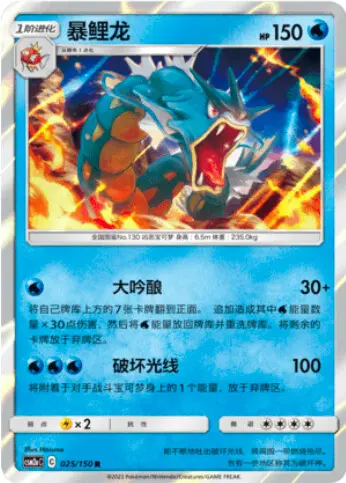 暴鲤龙150血线,主要用一技能,大吟酿,一水能启动,将己方卡组最上面7张卡翻到正面,追加造成其中水能量数量乘30的伤害,然后把水能量洗回牌组,其他剩余的卡牌放于弃牌区。