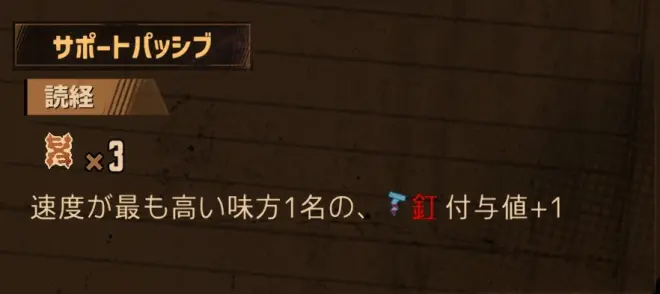 效果:速度最高的一名我方,赋予钉的数量+1