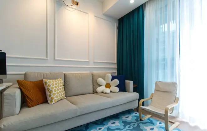飘窗没有影响室内采光,加上面积不大,就没必要过多纠结它的存在。将它保留,玻璃封窗,窗帘设计在飘窗里。白天可以作为休闲放松区,晚上可以作为常穿衣服临时存放区,爽!