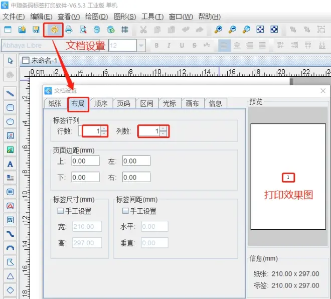 打开中琅条码生成软件,新建标签,调整一下标签的行列数、标签大小、间距等参数即可。
