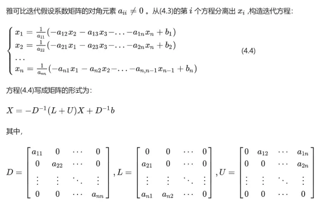 思考题:上述迭代公式,能够获得线性方程组(4.2)的解吗?答案请参考4.3.5解内容