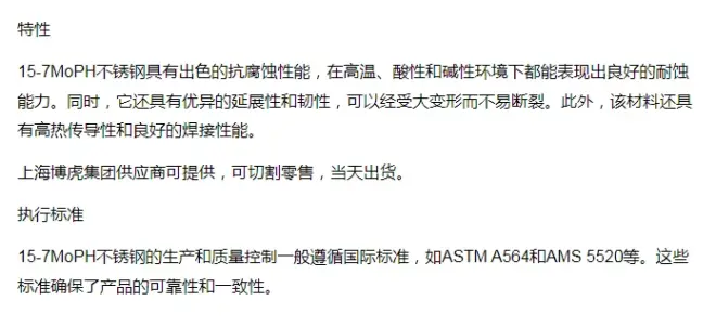 15-7MoPH不锈钢属于奥氏体不锈钢,是由铁、铬、镍、钼和磷等元素组成的合金。其化学成分设计合理,使其具有优异的耐腐蚀性能和机械强度。