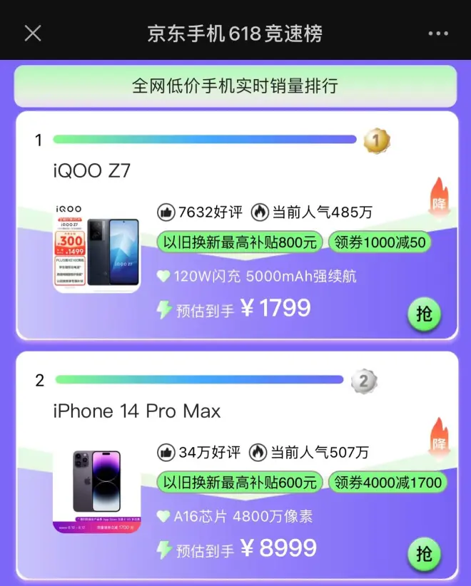 618手机竞速榜刷新:120W闪充手机跌至1239元,超越苹果升至第一