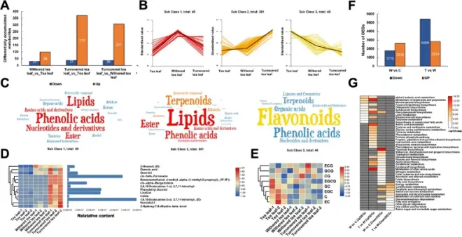 图4:乌龙茶采后加工中的差异代谢物(DMs)和差异表达基因(DEGs)。