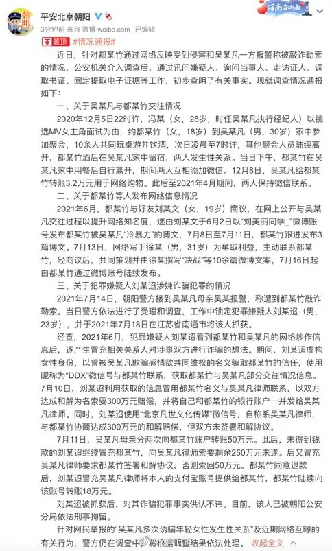 近日,针对都某竹通过网络反映受到侵害和吴某凡一方报警称被敲诈勒索的情况,公安机关介入调查后,通过讯问嫌疑人、询问当事人、走访证人、调取书证、固定提取电子证据等工作,初步查明了有关事实。现就调查情况通报如下: