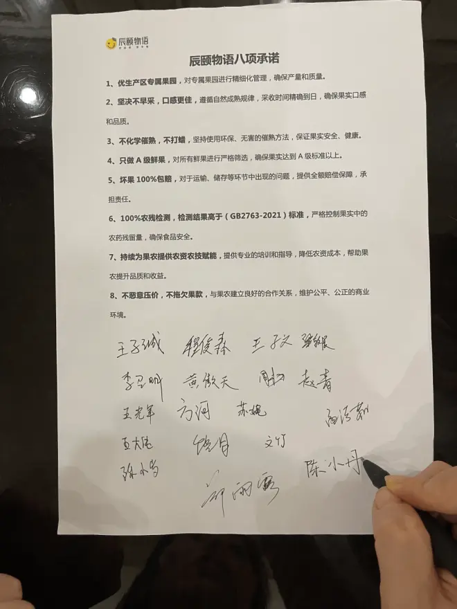 事实上,早在2016年辰颐物语就开始和广西、海南、云南等多地区的果农进行合作,除了为其赋能农资农技,提供专业的培训和指导外,还签署了“坚决不早采”“只做A级鲜果”“不恶意压价、不拖欠果款”等多项承诺。在经过多年的沉淀后,如今正式推出《承诺书》。