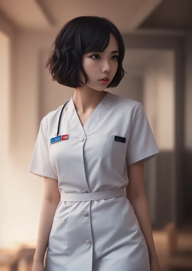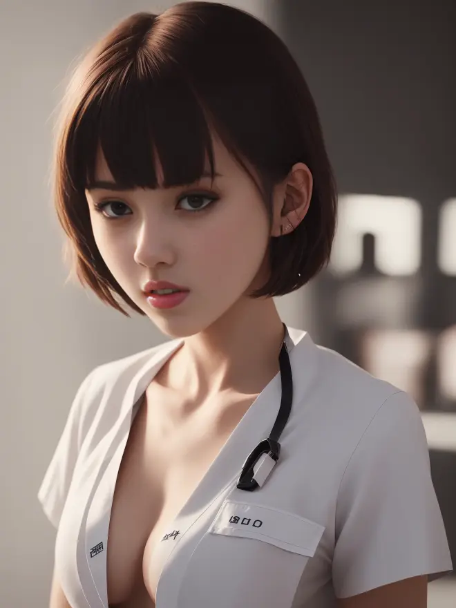 cinematic shot, centered, cinematography, intricately detailed, crafted, meticulous, magnificent, maximum details, extremely hyper aesthetic, realistic, (((1girl, solo))), 18age, short hair, black hair, (((center))), nurse uniform, nsfw,