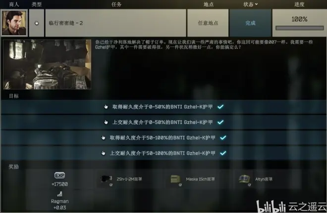 2、上交耐久度介于0-50%的BNTI Gzhel-K护甲1个
