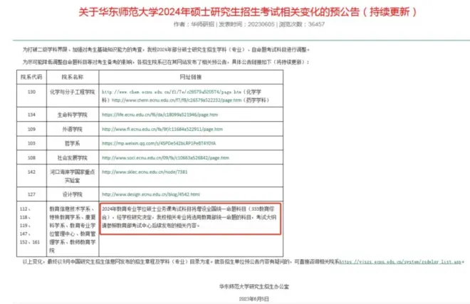 2023年6月5日,华东师范大学在2024年硕士研究生招生考试相关变化的预公告中提出,教育专业学位硕士业务课考试科目将增设全国统一命题科目(333教育综合),经学校研究决定,我校相关专业将选用教育部统一命题的科目,考试大纲请参照教育部考试中心后续发布的相关内容。