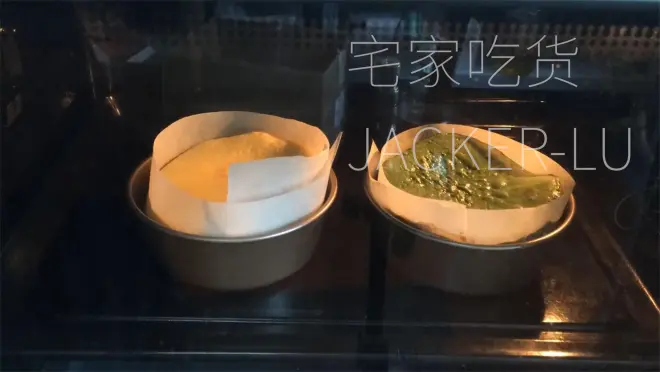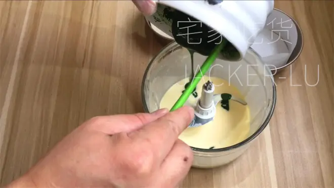 5、另一半倒入准备好的抹茶液,继续打发成均匀的糊状,同样倒入模具里。