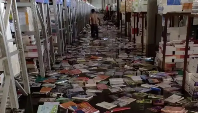 今天,受灾损失严重的中国图书网上了热搜,他们的库房内还有400多万册的书籍。