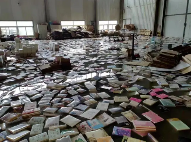 工作人员称所有书几乎都变成了废纸,库房的清淤工作估计要一个月以上,保守估计15日内都无法发货。