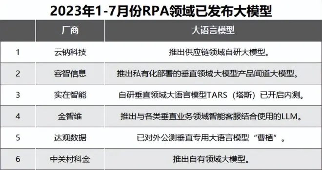 除了这些措施,为了更好的融合LLM并使其发挥更佳性能,还有一些RPA厂商推出了自有的领域大模型。从调查来看,目前至少已经有6家厂商推出了专有领域模型。