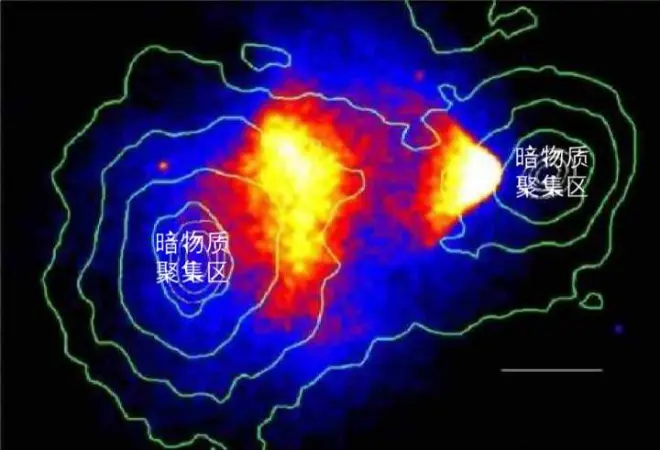 照片中可以看出,两个星系的发光物质主要集中在两片白色区域,红色区域次之,蓝色区域最少。然而通过引力透镜效应分析,研究者惊奇地发现,实际质量聚集的区域并不在亮度最高的地方,而是跑到了发光物质的前面。
