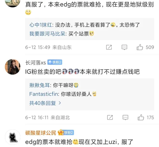 一些抢到票的网友都在庆幸,毕竟那些对于比赛没有特别执着的玩家,真的是可以大赚一笔了。虽说现在的lpl门票已经实名制了,但是并不是购买的时候就直接实名制,而是购买之后绑定身份证入场。也就是说,买票的阶段还是可以随意进行的,只是在进场的时候需要实名。所以说官方的实名要求,对于那些倒卖门票的人来说并没有限制,只能说uzi的热度真的太高了。
