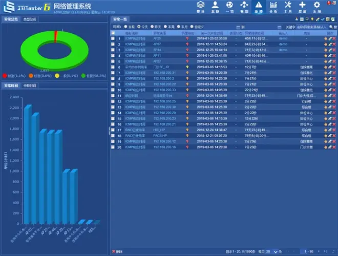 网强IT综合管理系统的对各种网络设备、服务器、应用等资源,进行24小时监控,并建立相对应的预警和告警机制。多种告警方式,可以把不同的故障告警给到不同的负责人员,并与运维联动,让运维责任明确,分工分明,并且运维人员则可以由异常信息直接关联到知识库,从知识库中找到故障的解决方案,从而及时回复故障保障业务系统持续运行。