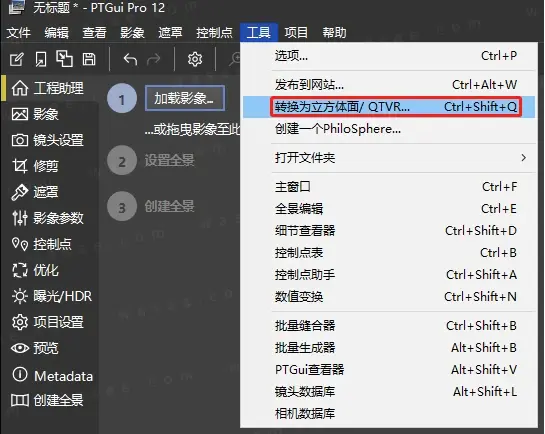 打开“转换为立方体面”工具,需要在 PTGui Pro 主界面菜单栏点击打开【工具】>【转换为立方体面】,进入“转换为立方体面”界面,快捷键是“Ctrl+Shift+Q”,如上图所示。