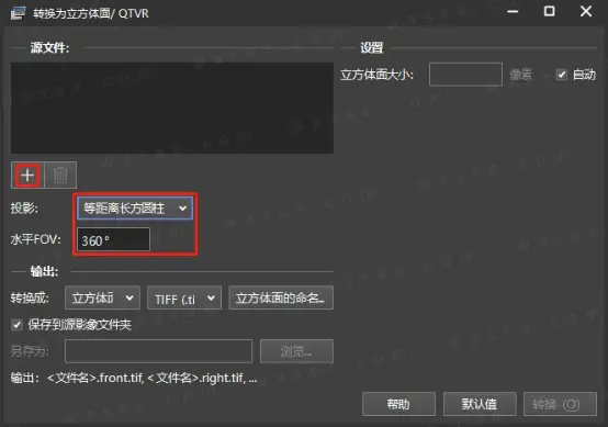 “转换为立方体面”界面,如上图红框圈中区域,“投影”选择“等距离长方圆柱”,“水平FOV”选择“360°”,点击“+”号按钮,加载需要转换成立方体面的全景图。