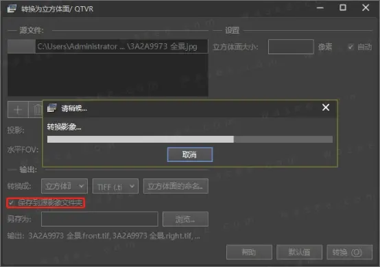 我们再来看“转换为立方体面”界面的输出设置,选择“立方体面,6个单独的文件”,勾选默认“保存到源影像文件夹”,点击【转换】按钮,等待进度条走完,转换立方体面完成,如上图。