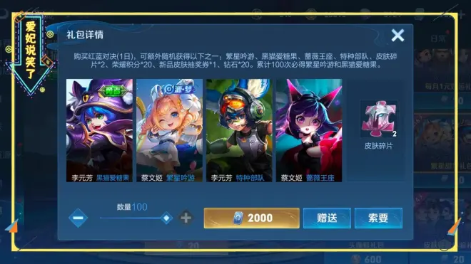 没错,这个活动每名玩家最多购买100个礼包,而只要购买100个礼包,你就能够百分之百拿到这里面的皮肤。